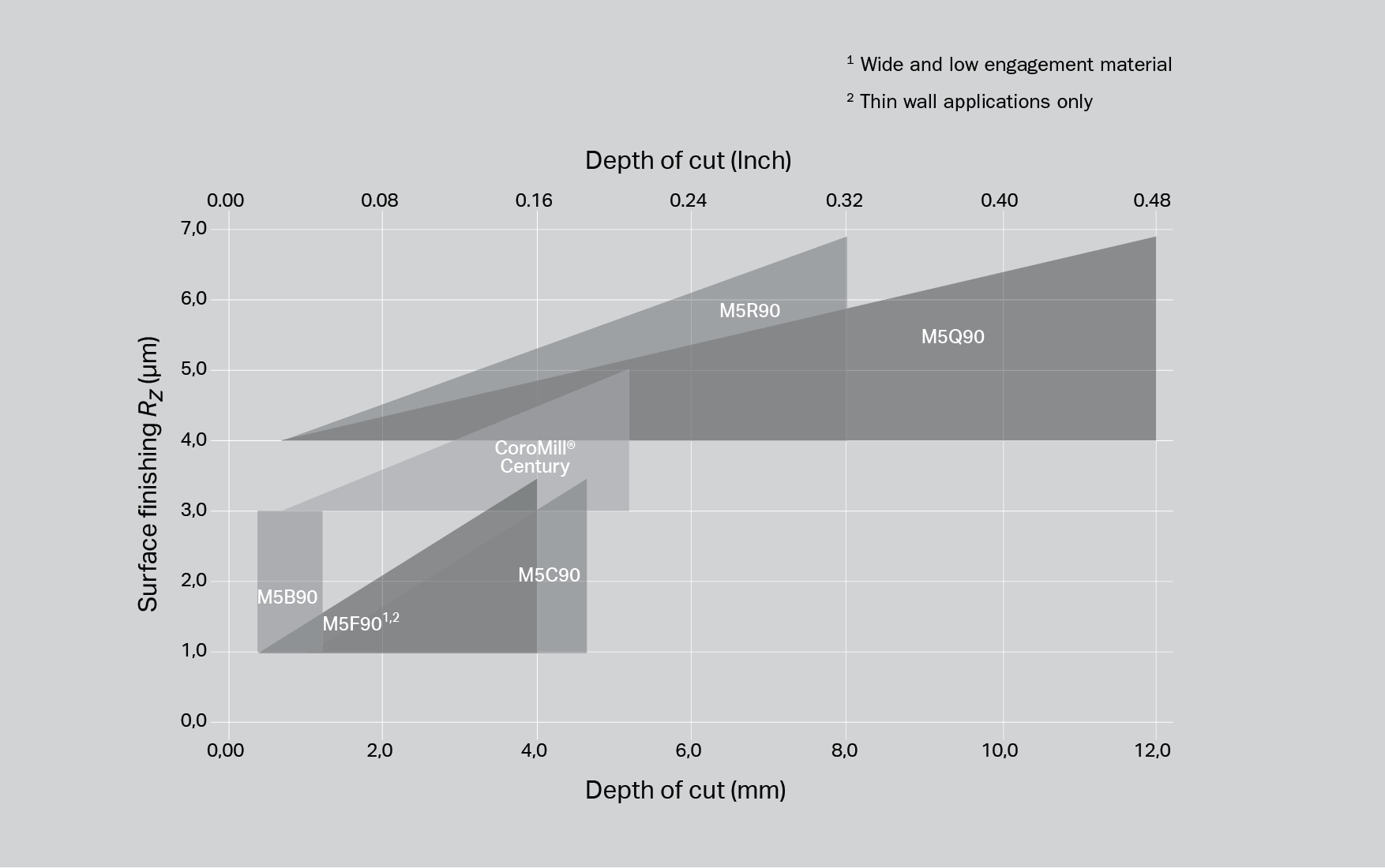 Also included in the family is the M5B90 super-finishing face mill with its unique axial and radial positioning of inserts. This configuration, together with the wiper insert, ensures burr-free cutting with excellent surface quality, as a manufacturer of cylinder heads for passenger cars recently discovered. The company was experiencing process instability and issues with burrs, while another problem was unpredictable insert life, which depended on cartridge adjustments that differed from set-up to set-up. Switching to the M5B90 cutter provided a smooth finishing operation with predictable wear and no burr. The tool produces only very thin chips, which are easily removed during the cutting process to avoid any damage to the component face. In addition, changing to M5B90 extended tool life from 30,000 to 45,000 parts on average.