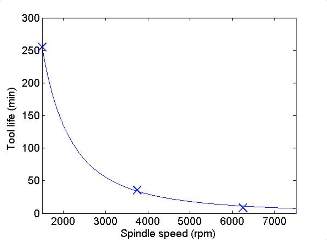The tool life model constants were determined from a least-squares best fit to the data: vT0.455 = 1,120. The data points and fit are presented in Fig. 3. Given this model, a spindle speed may be selected to give the desired tool life. For example, if a tool life of 60 minutes is desired, the spindle speed should be 2,800 rpm or lower in this case.