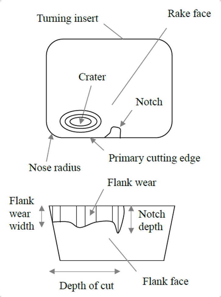These wear mechanisms combine to form characteristic wear features on cutting tool surfaces. Common wear features include flank, crater and notch wear. These are depicted in Fig. 1. In many cases, a single wear feature will dominate, but all may occur simultaneously.