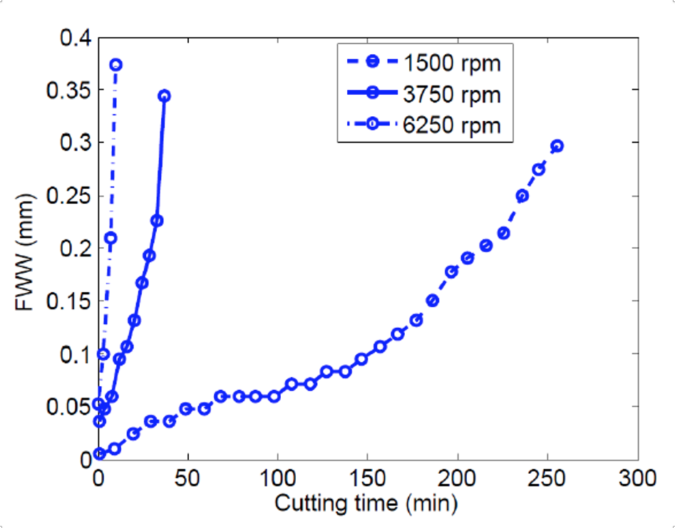 The FWW progressions for tests at spindle speeds of 1,500 rpm, 3,750 rpm and 6,250 rpm are shown in Fig. 2. The tool life was defined as the time required to reach a FWW of 0.3 mm. As expected, the tool life decreased with the increased cutting speed (and temperature). The test results are summarized in Table 1.
