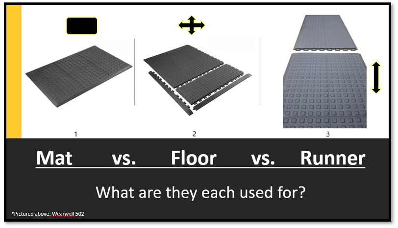 A typical mat may be made from one material, multiple materials, or multiple materials adhered together. However, a typical mat is NOT made to interlock with other mats. If you are looking at an interlocking mat, modular mat, or tiles that connect together, you are looking at anti-fatigue flooring or runners. So what’s the difference anyway, and which one is right for me?