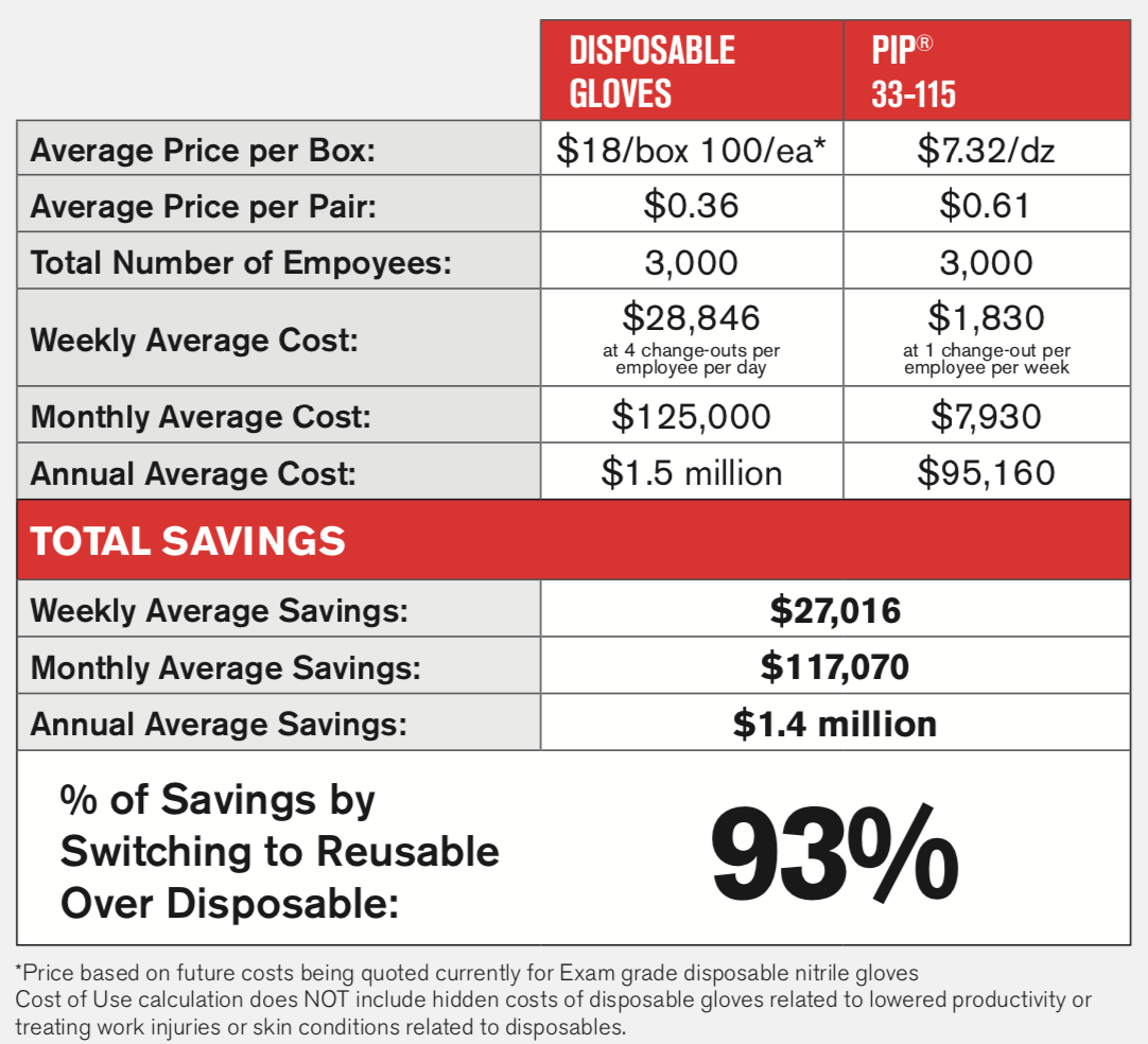 According to PIP calculations, the average company with 3,000 employees that currently pays 36 cents for a pair of disposable gloves and switches to paying 61 cents for a pair of reusable coated gloves (in this case PIP’s 33-115 reusable seamless knit polyester glove with polyurethane coating) can achieve monthly average cost savings of $117,070.