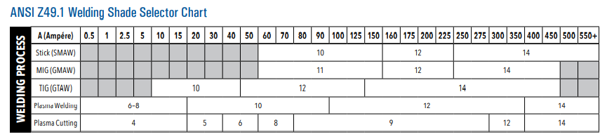 Use the chart below to help you find the right shade for your welding process.