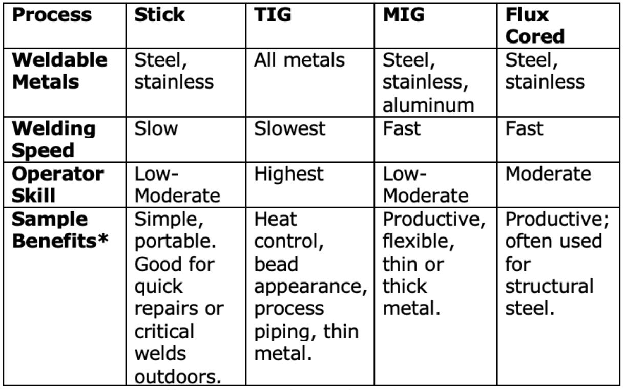 There are four primary welding processes for fabrication and maintenance. They are stick, TIG, MIG and flux cored welding.