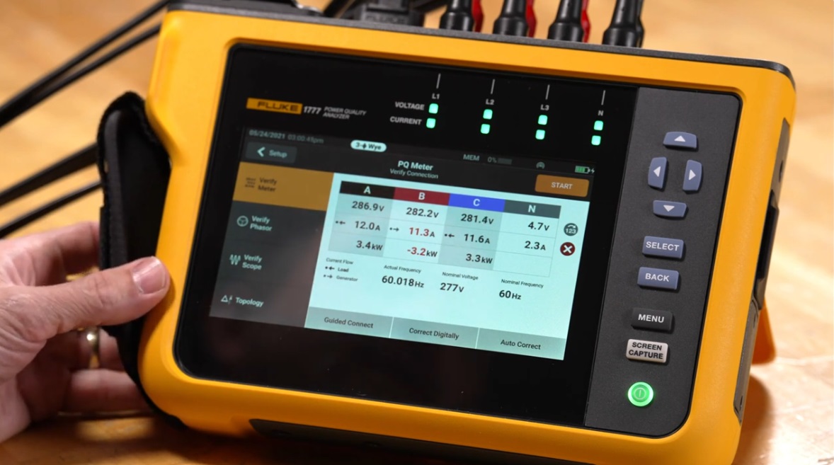 The system will guide you through the setup process, showing what to plug in where, and which buttons to push as you move along. The analyzer is also set up with built-in event triggers, based on power quality standards. Though these settings are fully customizable, you don’t actually need to go in and modify unless you want to make changes from a standard.