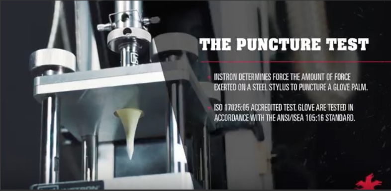 MCR's ITC Lab tests gloves to ANSI/ISEA 105-16 for puncture resistance, while utilizing Clause 6.4 of EN388:2003 as the test method. The Instron machine, shown in the image above, determines the amount of force exerted by a steel stylus to puncture a glove palm. The stylus is pushed through the material at a fixed speed, providing a measurement to show the newtons of force required to puncture through the material.