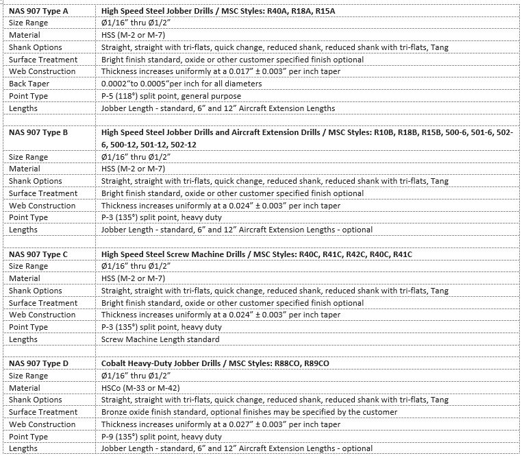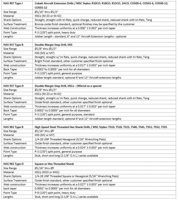 The National Aerospace Specification for drills are covered by three (3) standards – NAS907, NAS937 and NAS965. Each of these specifications has “Types” within each standard to call out the specific size of the drill. The standards call out the material, surface treatment and point.