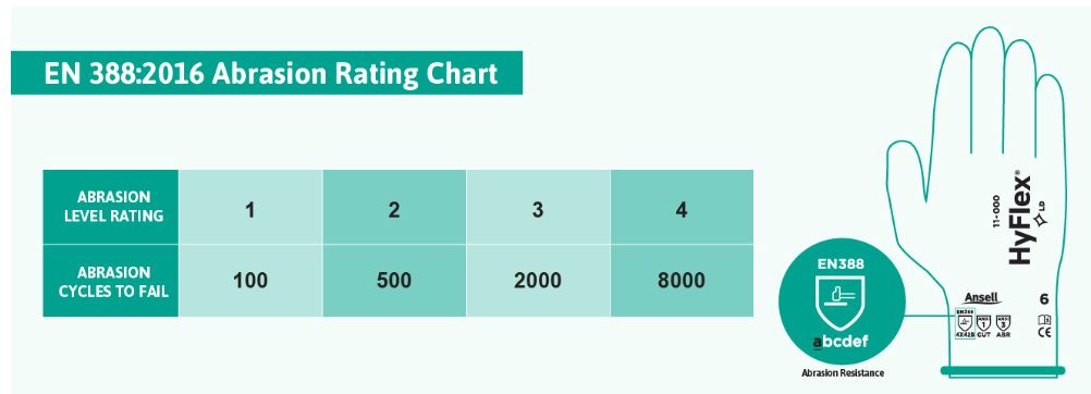 Also updated in 2016, the EN 388:2016 standard is set up for European regions and also taken over by other regions such as Asia, Australia & New Zealand and South American regions as part of their local standards. The EN 388 shield pictogram reports up to five different mechanical performance measures with the first position (“a”) representing abrasion resistance on a scale of 1 to 4. Unlike the ANSI standard, the EN 388:2016 standard leverages a Martindale abrasion machine to measure the abrasiveness of each glove. A piece of the glove's palm is cut and placed before a wheel covered in abrasive paper. The glove material is then abraded until a hole is present. The test is performed a total of four times. The test results demonstrate that the lowest number of cycles before creating a hole between the four trials becomes the glove's abrasion rating. Like the ANSI Standard, the greater the number of cycles it takes to break down the safety material, the greater the abrasion safety rating. Shown below are the EN 388:2016 abrasion standard ratings: