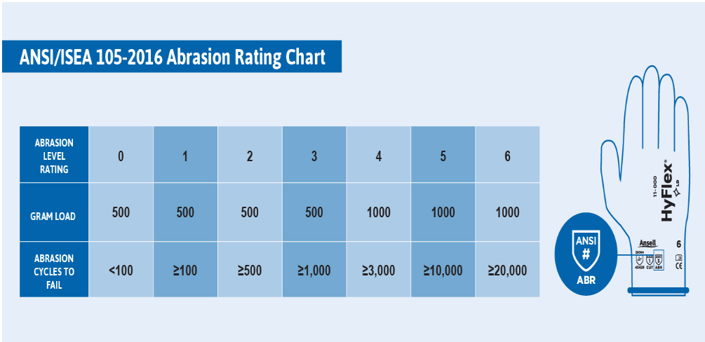 The standard is based on ASTM D2289-10 and ASTM D3884-09 abrasion testing methods which measure the number of cycles required for an abrasion wheel to break down the glove material. Levels 0 to 3 are measured with a 500-gram load on the abrasion wheel while levels 4 to 6 are measured with a 1,000-gram load. The glove material is then mounted and abraded by the spinning wheel until the material is worn through, creating a hole, under the corresponding weight. The greater the number of cycles it takes to break the material down, the higher the abrasion rating. The results are shown in the new ANSI abrasion standard rating chart below: