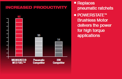The M12 FUEL™ Ratchets are the most powerful 12V ratchets in the industry, the first true replacement for pneumatic ratchets, hoses and compressors.