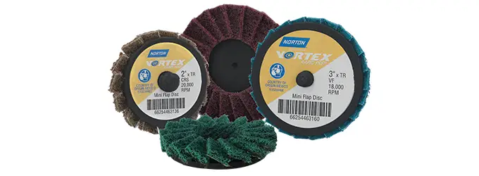 Norton Vortex Rapid Prep mini flap discs, featuring layers of non-woven surface conditioning material, offer longer life over traditional single layer products. High-performance Vortex grain technology cuts coarser and finishes finer with a smear-free resin system. Get an excellent cut rate with fewer product changes to boost efficiency.