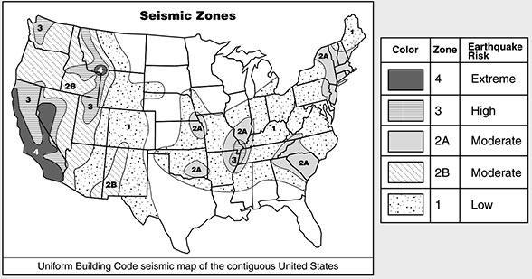 The table and map below outline seismic zones from 1 (lowest risk) to 4 (highest risk), with stricter requirements as the zone number increases. Incorporating seismic design standards in rack systems is strongly recommended, especially in high-risk areas, to prevent catastrophic failure. Taller racks and high-density, narrow aisle systems further increase collapse risk, particularly in zones 3 and 4. For new construction or renovations in these zones, consult your local building department for the latest code requirements.